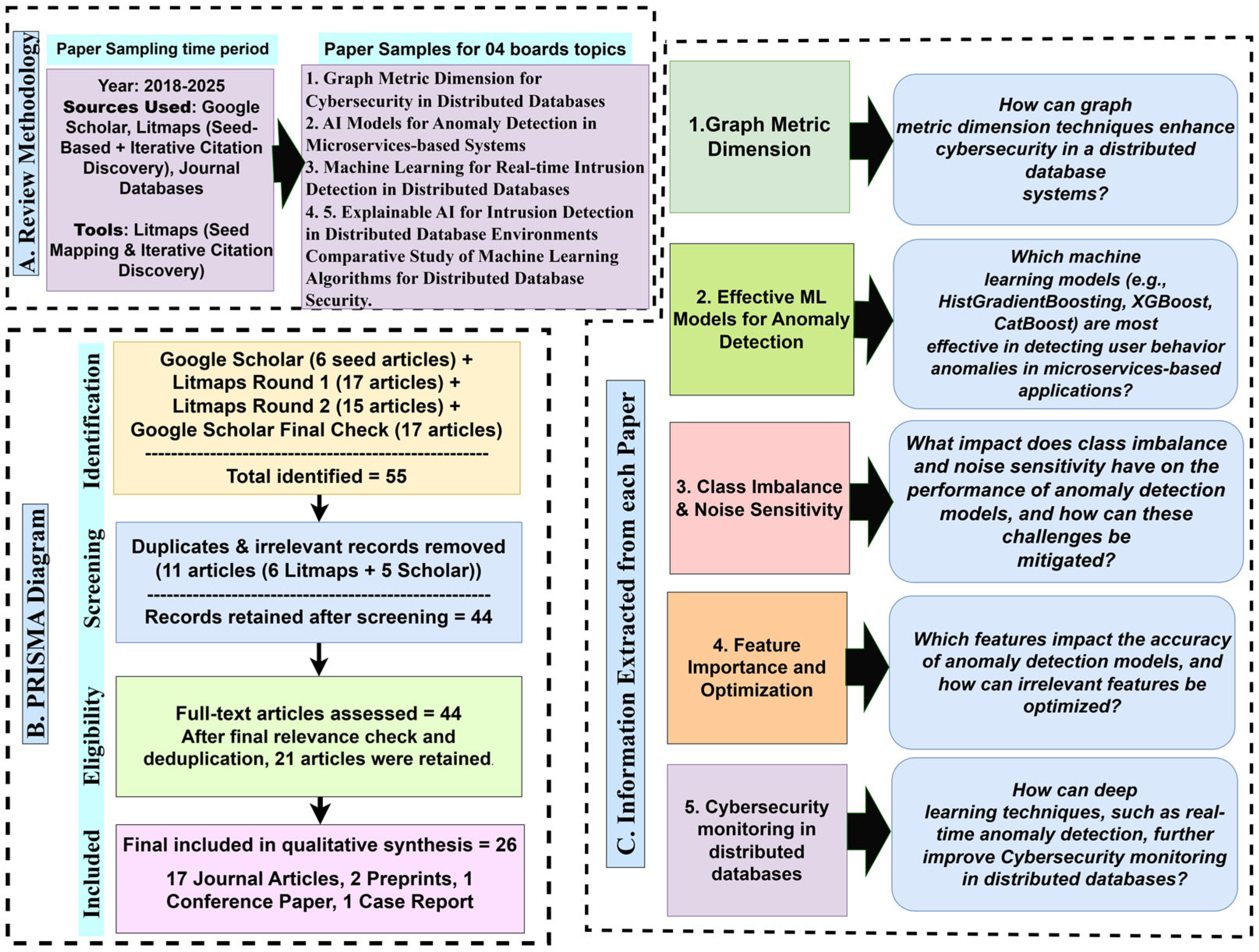 This section contextualizes the suggested framework within the established literature concerning the graph metric dimension, privacy-conscious graph models, and graph-based anomaly detection within distributed databases and microservice architecture. Previous research has investigated these areas from theoretical, algorithmic, and practical viewpoints. Nevertheless, a comprehensive examination of existing methodologies reveals distinct compromises concerning scalability, adaptability to evolving systems, the capacity for anomaly localization, and the preservation of privacy. The subsequent subsections will assess representative approaches, summarize their fundamental concepts and explicitly highlight the limitations that underpin the rationale for the proposed framework. This study addresses a niche research area where directly comparable works are limited. The relevant literature is therefore analyzed through intersecting themes across multiple studies; therefore,