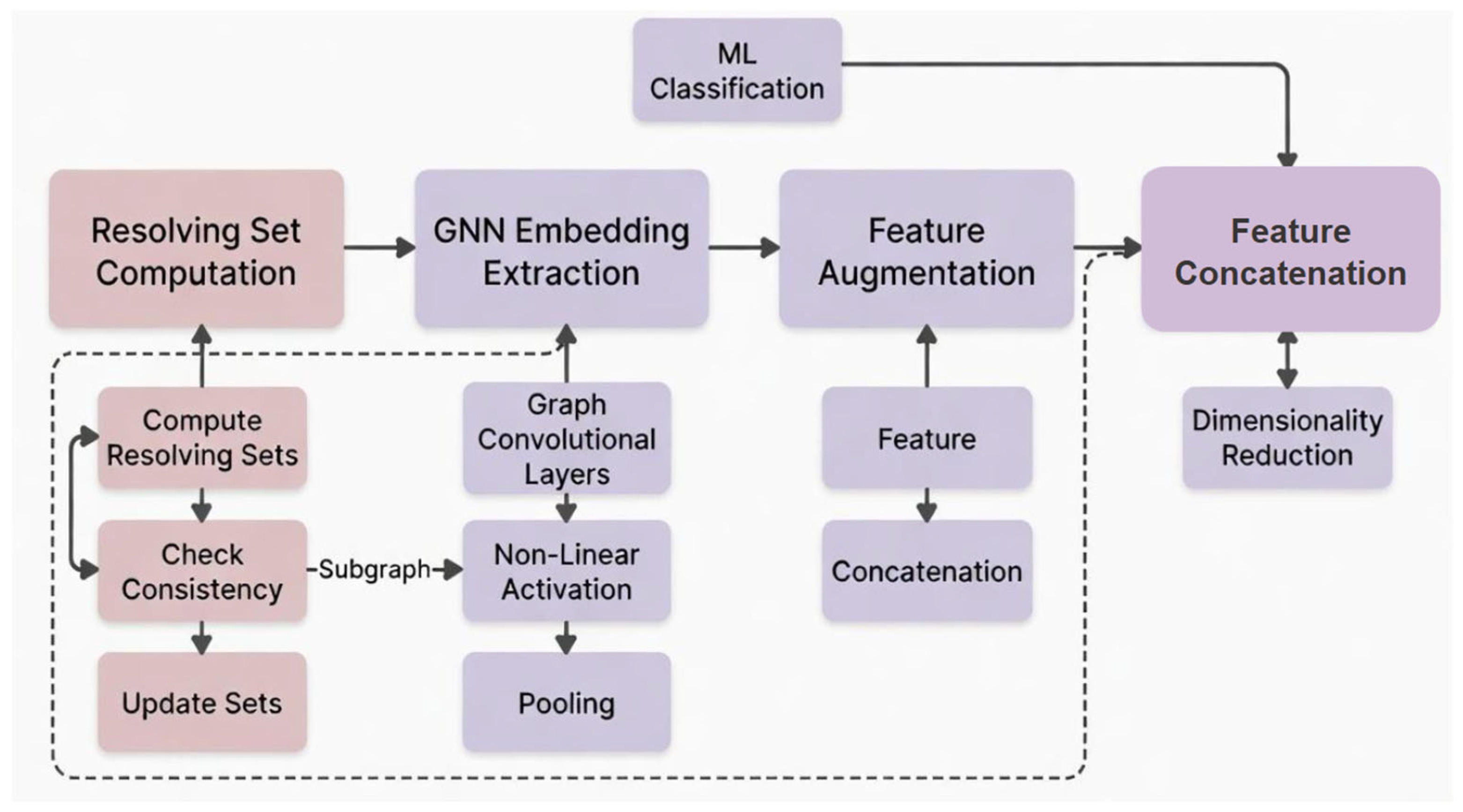 GMD-AD is quite different from full-graph GNNs, which compute embeddings over all nodes, as it only computes graph neural network embeddings over resolving-set subgraphs, and classifies them with a gradient boosting classifier (CatBoost, XGBoost). Our hybrid approach results in 50–70% reduced latency as compared to standalone GNNs (geeking the numbers over time), decreasing the latency grind while leveraging the robustness of noise in graph structure.