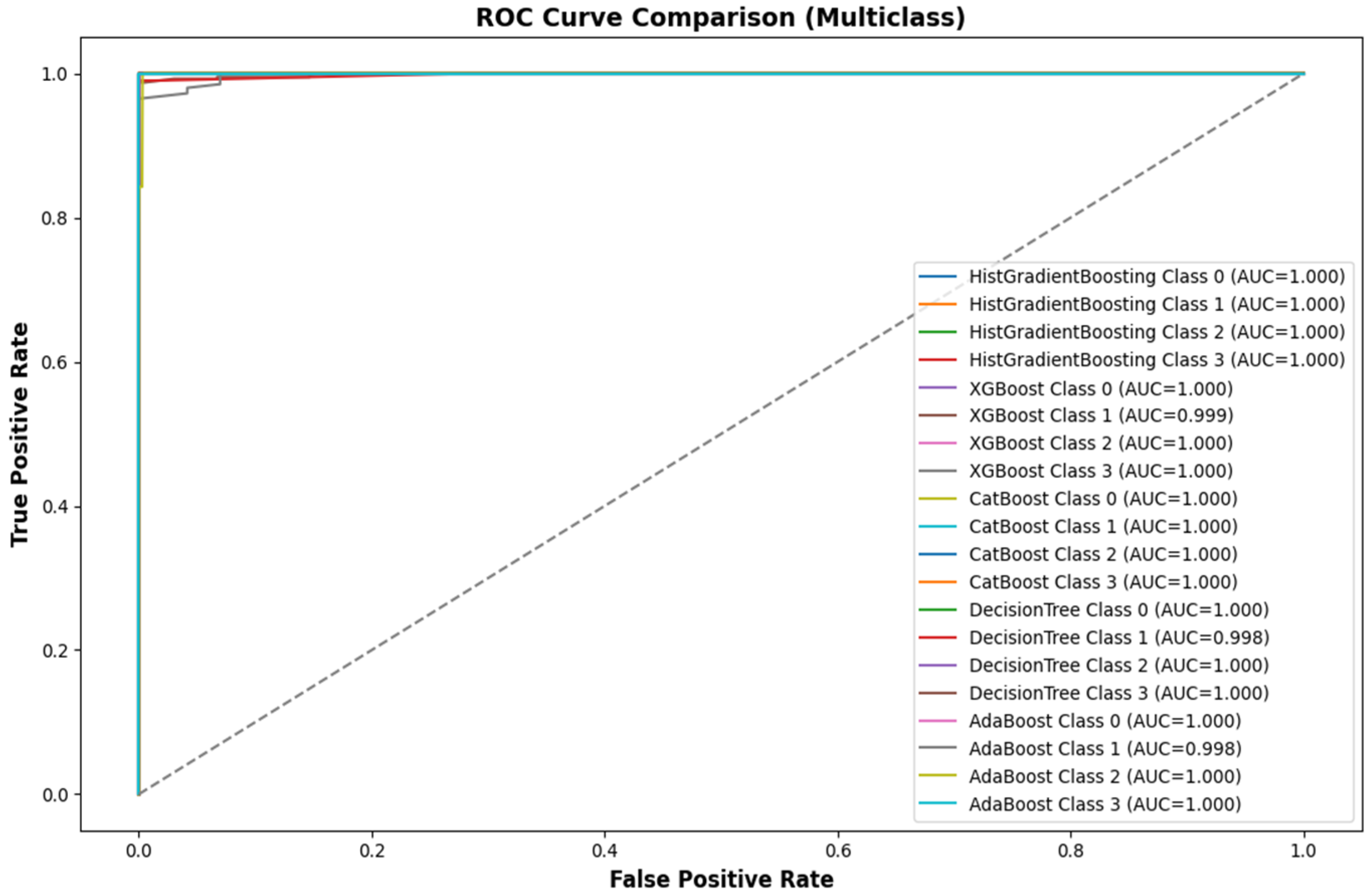 Figure 13 yield AUC ≈ 1.000 for top models, with DeLong’s test confirming no significant difference between CatBoost and HistGradientBoosting (