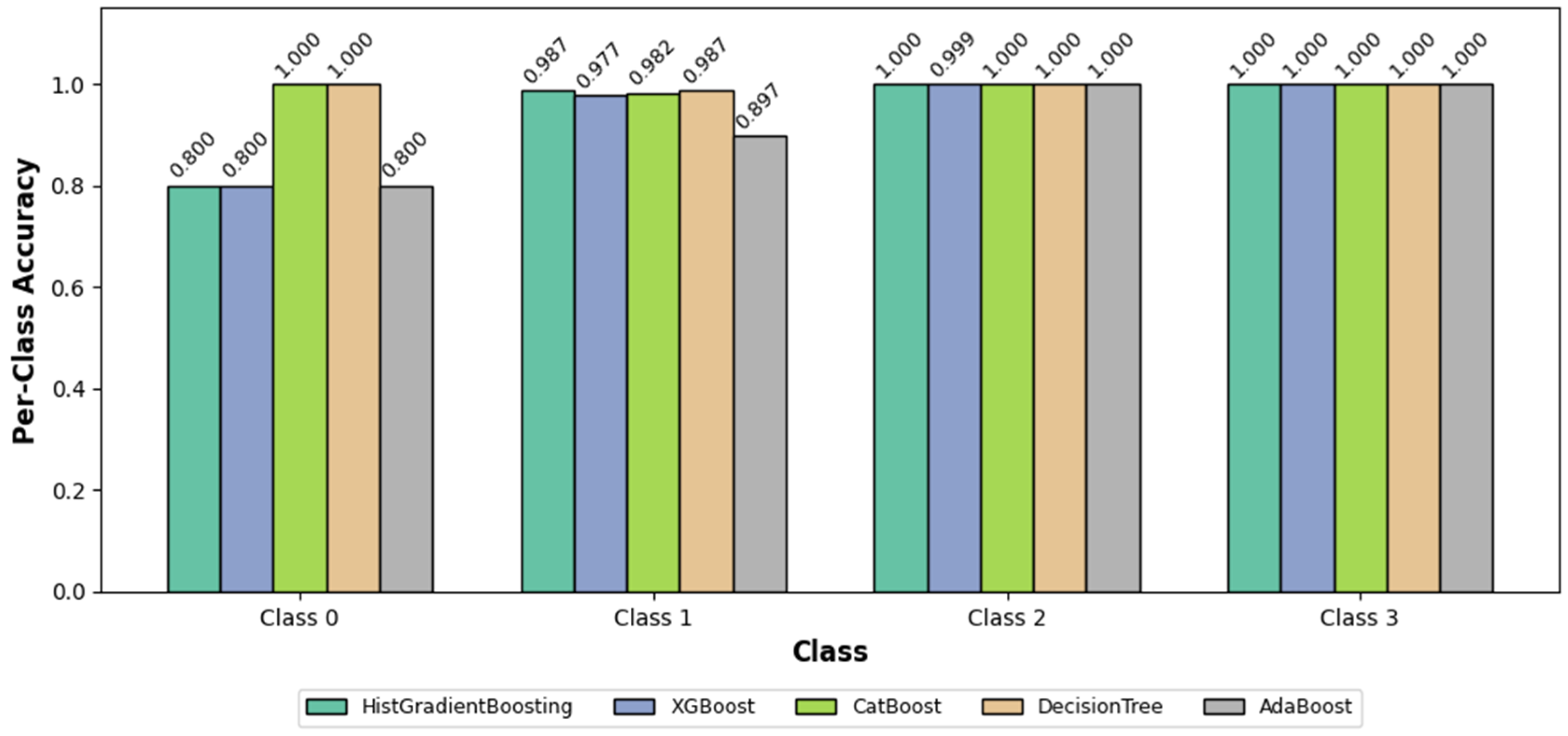 Table 18 provides class-wise metrics, highlighting CatBoost’s balanced performance across anomaly behaviors (classes 0–3). Per-class ANOVA (not tabulated) shows significant model effects for Class 0 (F = 12.45,