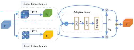 In the adaptive fusion part, the global feature enhancement map and local feature enhancement map , which have been processed by the ECA module, are first spliced in the channel dimension. Then global pooling is used, and then a tensor of length is output after a convolution block, and then the result is mapped into the interval using Sigmoid, after which the result is divided into two copies of weights and of length .