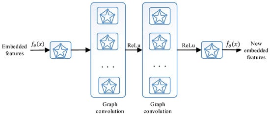 The graph neural network module aggregates node features within the graph and embeds the entire graph into a new feature space, thereby enhancing the representation of neighborhood information. In this work, we employ a graph convolutional network propagation mechanism to propagate both sample features and graph-structured information from the support set into a new embedding space, facilitating subsequent metric computation. The structure of the propagation network is illustrated in Figure 4.