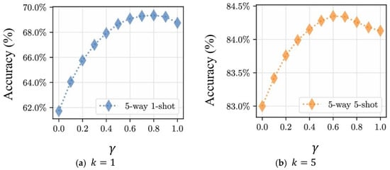 The classification accuracy of the algorithm was evaluated using 5-way 1-shot and 5-way 5-shot; 5-way 1-shot means that 5 categories were randomly selected and 1 image was chosen as a sample in each category; 5-way 5-shot means that 5 categories were randomly selected and 5 images were chosen as samples in each category. At the same time, the classification accuracy is used to evaluate the performance of the model, which is measured in %; the higher the value, the better the performance of the model and the better the classification effect. For the problem of FSIC, the specific definition of accuracy refers to the proportion of correctly classified samples in each validation batch to the total number of validation samples, as shown in Equation (11):