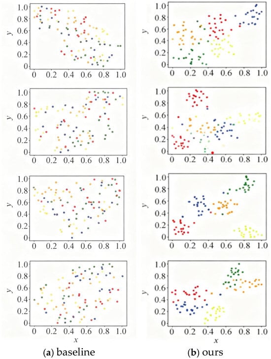 As shown in Figure 8a, the baseline model—which does not incorporate the proposed modules—struggles to separate different bird species in the CUB-200-2011 dataset. This difficulty arises because the dataset contains only bird images, all of which share general avian characteristics. The baseline’s relatively shallow feature extraction capability leads to poor generalization and confuses the characteristics of different birds, thereby hindering classification. In contrast, Figure 8b demonstrates that our model, augmented with GLCAM and adaptive feature aggregation across network layers, adjusts the sample distribution to produce clearer separation between classes. This enhanced discriminability reduces classification difficulty and confirms that the features learned by our model are more distinctive, contributing directly to improved classification accuracy.