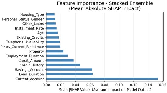 SHAP analysis (Figure 2) identified Current Account status (mean |SHAP| = 0.153) as the predominant predictor across all models, followed by Loan Duration (0.064) and Savings Account (0.063). Credit History (0.046) and Credit Amount (0.038) demonstrated moderate influence, with consistent importance patterns observed throughout model variations.