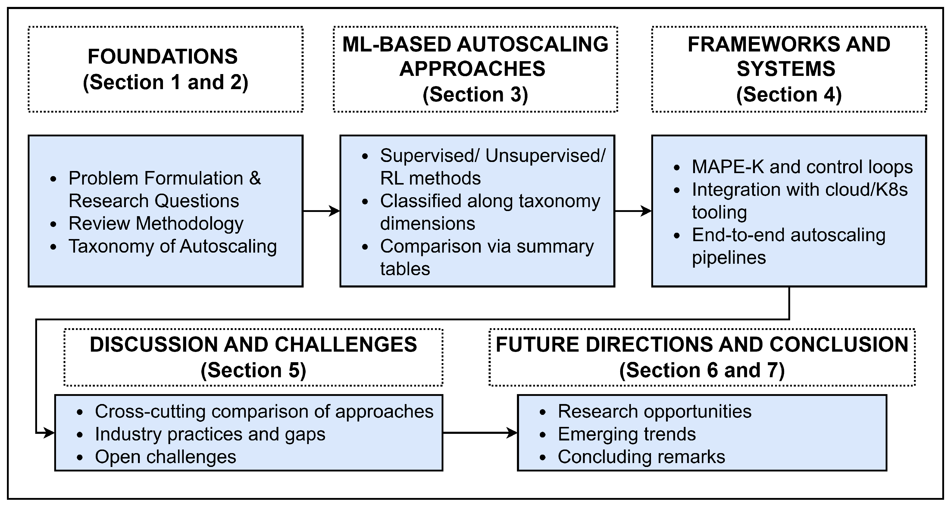 - Systematic classification of ML techniques. We systematically examine supervised, unsupervised, and reinforcement learning approaches to autoscaling, characterising each by workload types, input signals, control decisions, and optimisation objectives, and provide comparative summaries of representative methods.