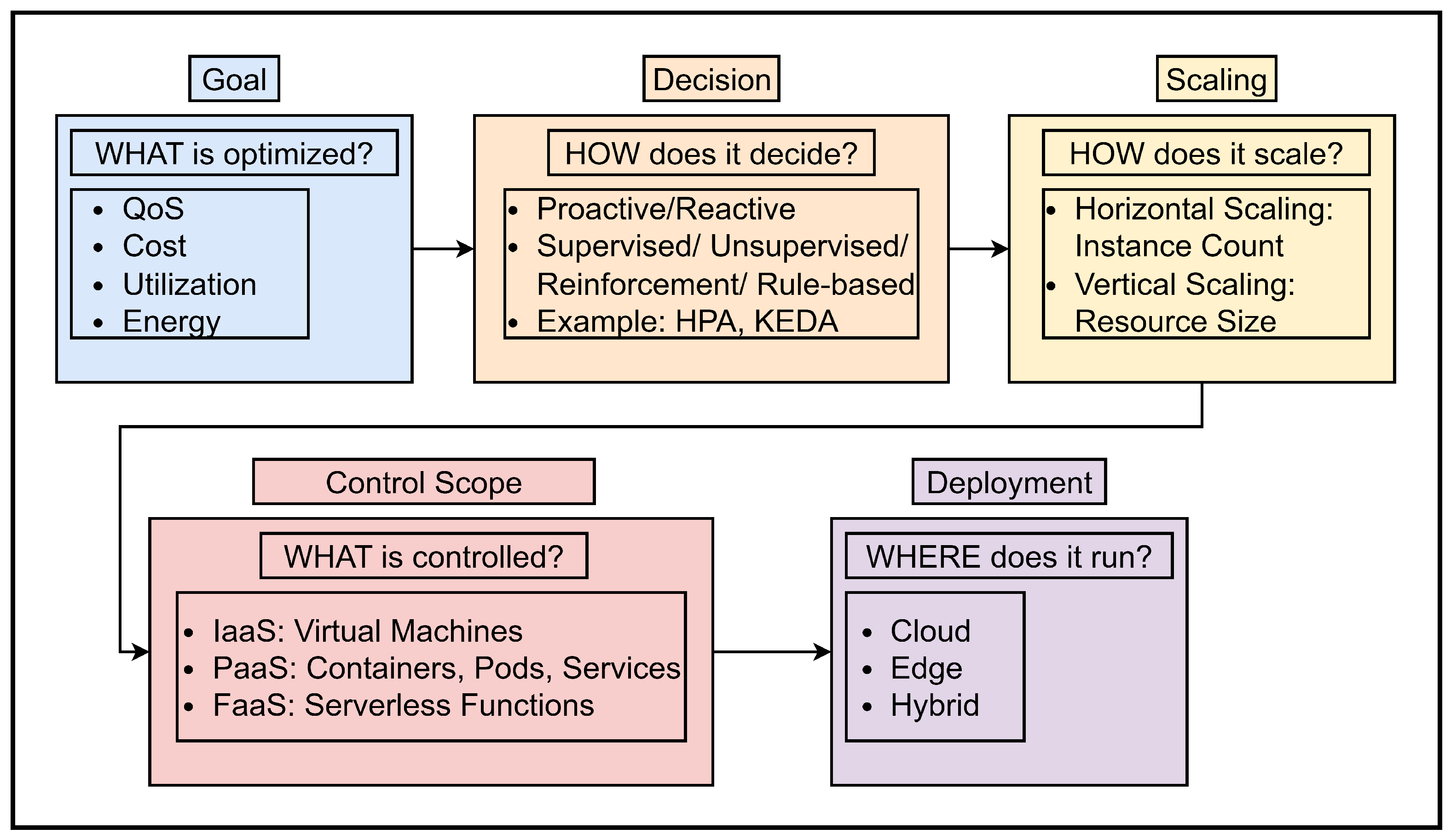 - Taxonomy of ML-based autoscaling. We propose a taxonomy for machine learning-based autoscalers across five dimensions: goal, decision logic, scaling mode (horizontal, vertical, or hybrid), control scope (e.g., VMs, containers, services), and deployment setting (cloud, edge, hybrid), and use it to classify existing approaches.