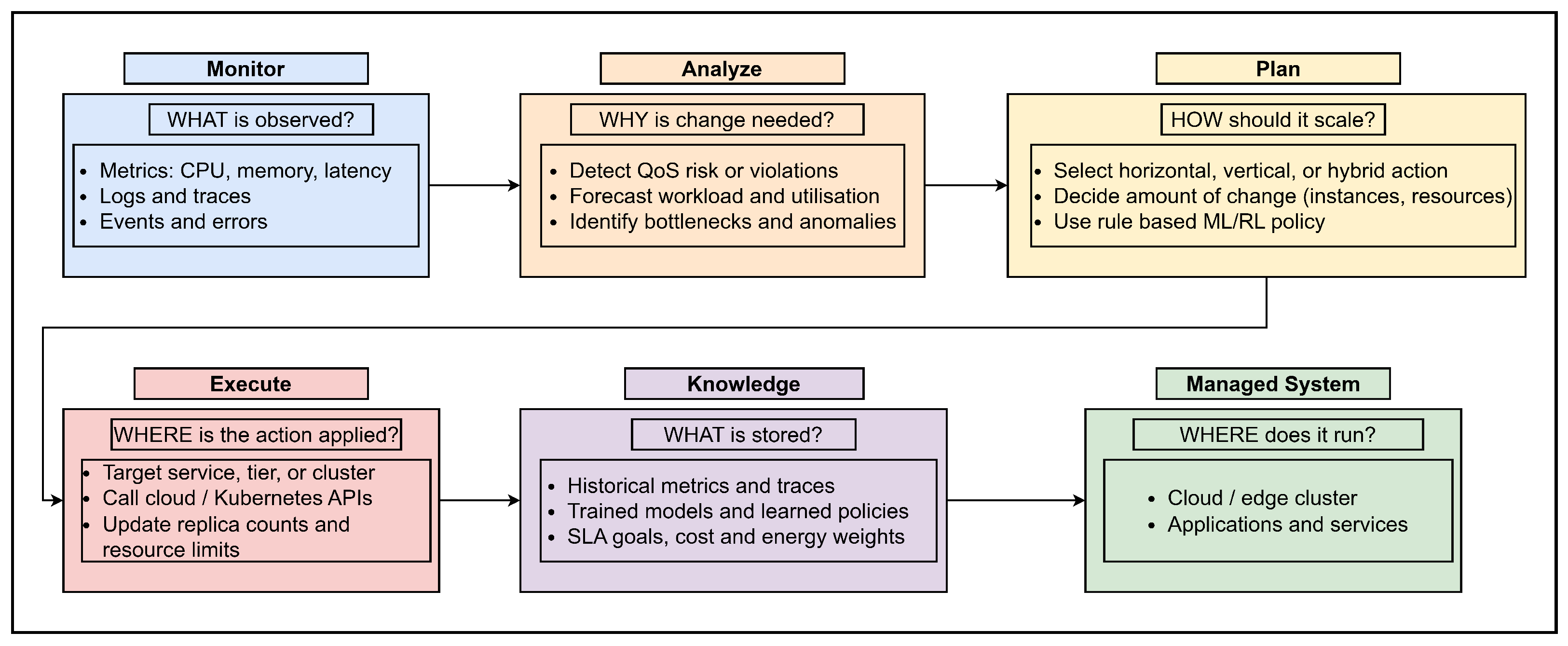 - Execute. Execution typically performs the concrete actions (calling cloud or Kubernetes APIs, updating replica counts or resource limits). ML is rarely used here, apart from occasional coordination of multiple actions.