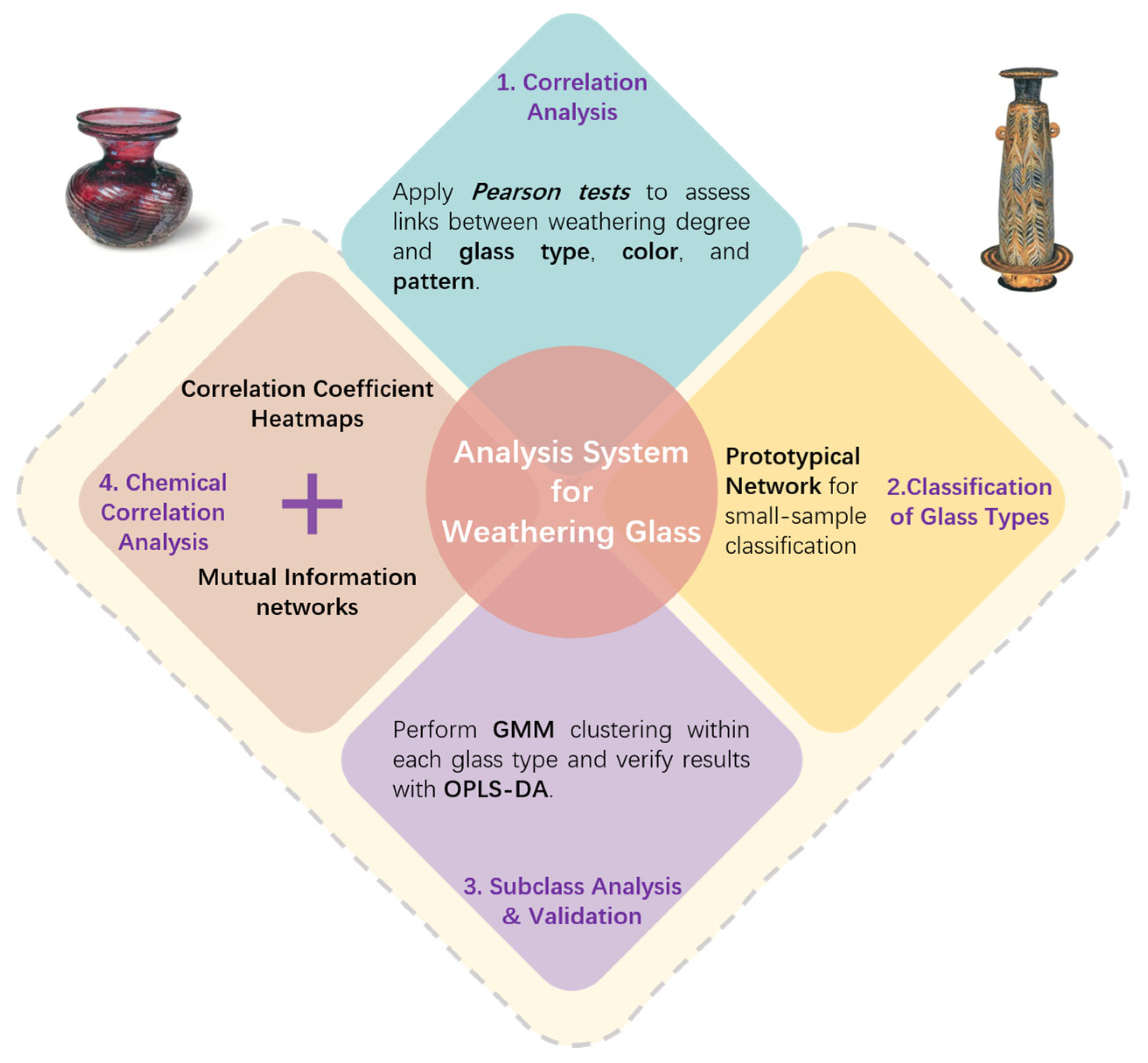 In this study, we designed a machine learning-based analytical system for the study of weathered glass, aiming to establish a comprehensive and data-driven framework for understanding, classifying, and interpreting glass weathering phenomena. The specific process of the whole model is shown in