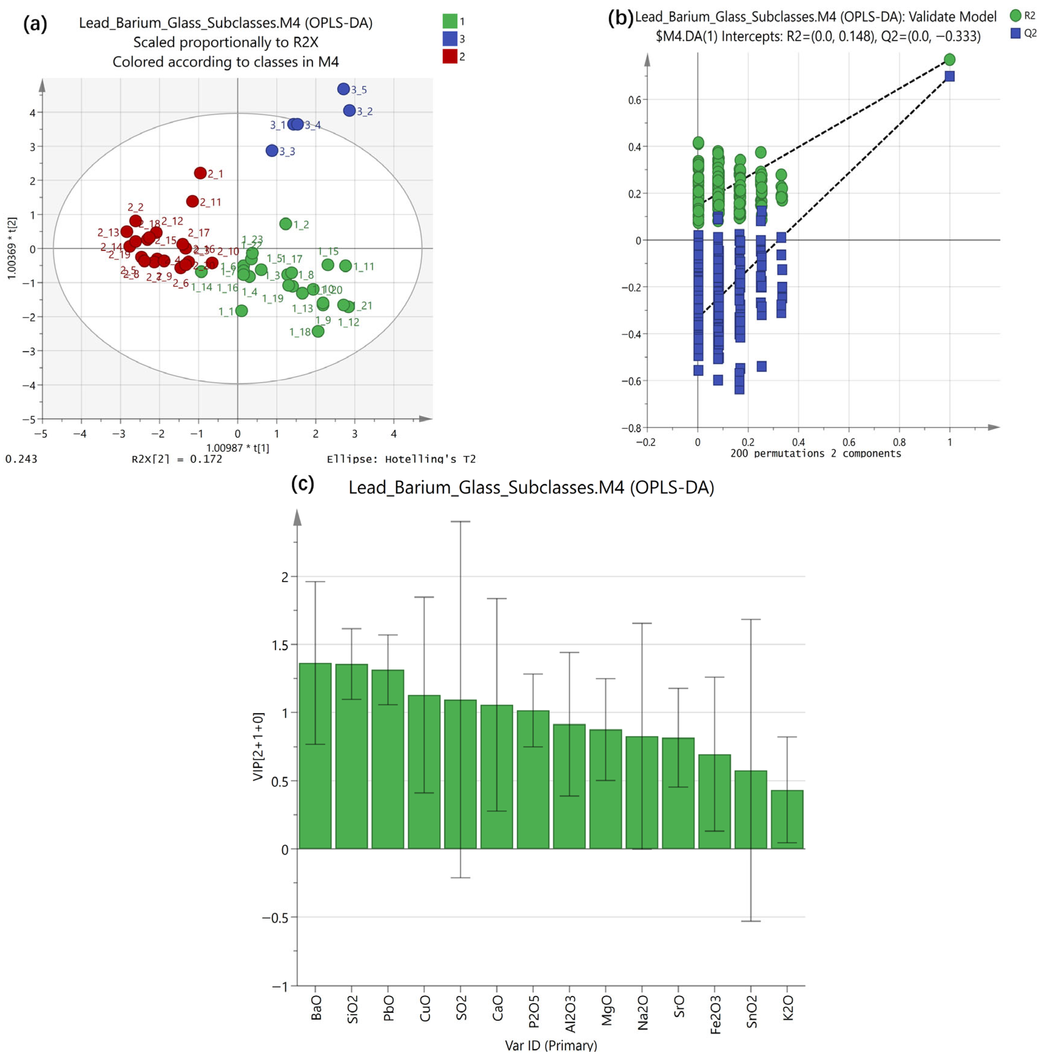The OPLS-DA model achieved clear separation among the three subclasses of lead-barium glass. The score plot (