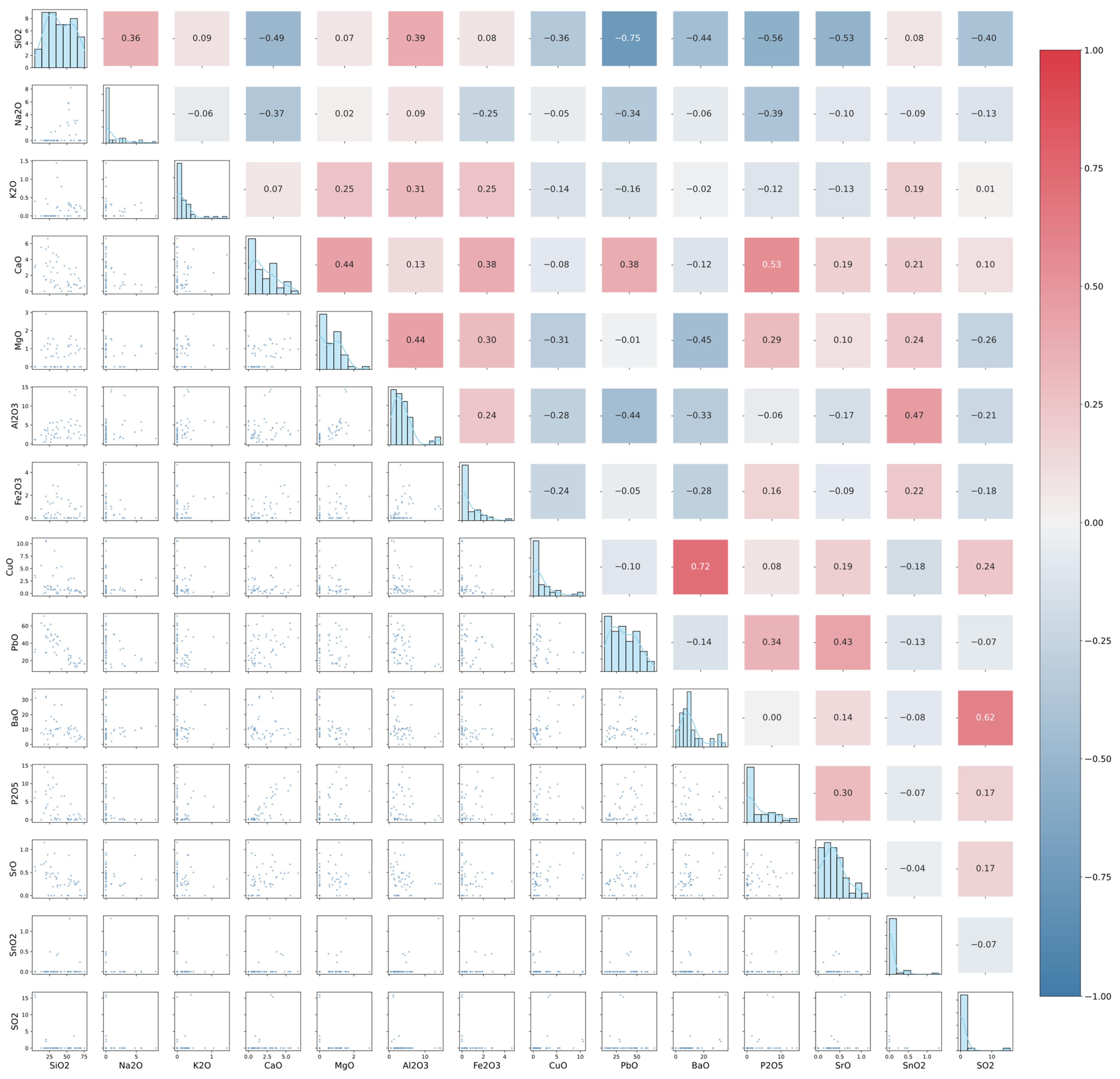 5, and SrO, suggesting that an increase in silica content is typically accompanied by a decrease in these oxides. In contrast, CuO showed a strong positive correlation with BaO, and BaO was also positively correlated with SO