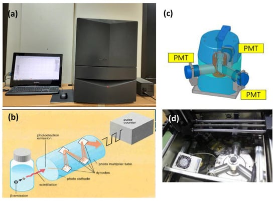 (a) The front view of the tritium-measuring device (Hidex 300SL), (b) a schematic representation of the scintillation principle, (c) the diagram of the photomultiplier, and (d) a photograph of the detector (Hidex 300SL).