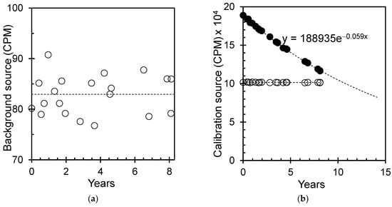 An eight-year record for the calibration source, including (a) the Type 5 sample of activity-free water for background, (b) the Type 1 sample featuring certified sources of 14C (shown as open circles) and 3H (solid circles). The flashes are measured in counts per minute (CPM). The dashed curve for 3H extends to visualize the exponential dependence with time.