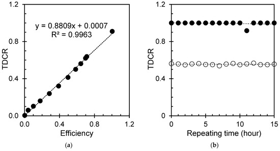 The Hidex 300SL liquid scintillation counter utilizes the triple-to-double coincidence ratio (TDCR) method to estimate the tritium concentration in groundwater samples. The TDCR method is specifically designed for measuring the activity of pure alpha- and beta-emitters. It involves calculating the detection efficiency by employing a statistical and physical model to analyze the photon distribution emitted by the scintillating source []. The Hidex 300SL device’s detector is fitted with three photomultipliers, allowing the measurement of the triple-to-double coincidence ratio. This method enables the determination of the counting efficiency of an unknown sample without requiring a standard source []. The TDCR value represents the ratio between the count rate of triple coincidences and double coincidences. As detected events increase, the TDCR value approaches higher efficiency []. Figure 4a illustrates the TDCR values plotted against the efficiency, displaying a linear relationship characteristic of the TDCR method utilized by the Hidex 300SL device.