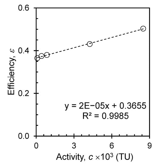The TDCR efficiency can be influenced by the activity concentration of the sample. A known activity of the spiked sample was diluted, and the activity concentration of each sample was measured along with its corresponding TDCR efficiency. A curve was obtained by plotting the TDCR efficiency against the known activity concentration, as depicted in Figure 5. The graph illustrates that the TDCR efficiency tends to be lower at lower activity concentrations, whereas at higher activity concentrations, the TDCR efficiency increases. This variability in TDCR efficiency with activity concentration arises from the finite resolution time of the detector and statistical fluctuations in the radiation. A similar pattern was observed in a study by Broda et al. []. As a result, before the experiment, the TDCR was calibrated for each sample to accurately measure its activity concentration.