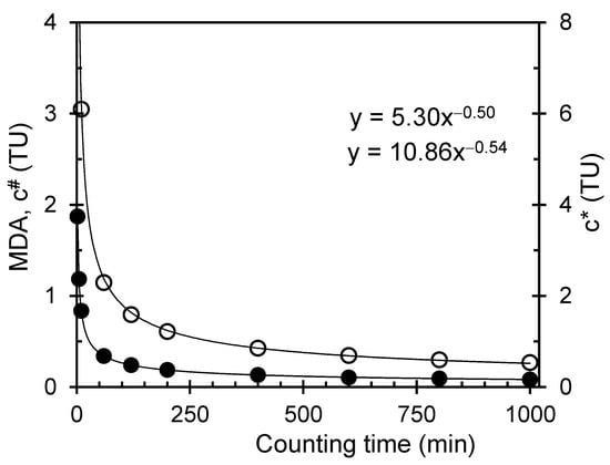 Counting time-dependent minimum detection activity, c# (TU) (open circle), and decision threshold, c* (TU) (solid circle), for a typical sample Gr-12 of the Type 4 sample.