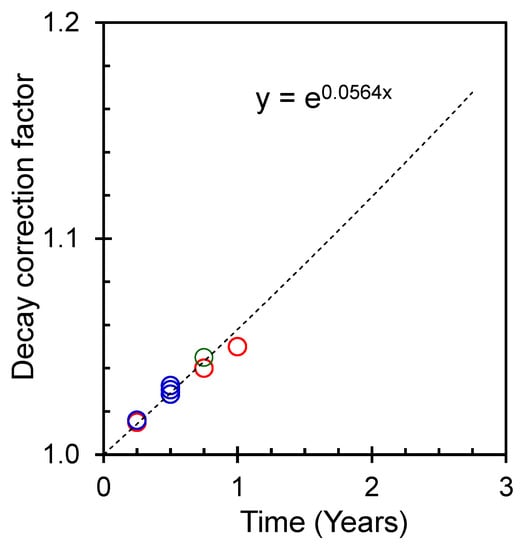 Figure 7 illustrates the decay correction factor as a function of time (represented by a dotted line). The plot shows that if the samples are appropriately sealed, stored, and counted by the LSC within a year, it does not show a significant correction. However, if the sample is stored for more extended periods, the decay correction factor (DCF) exhibits exponential growth over time. In this study, most samples were counted within a few months of sample collection, except for a few (represented by open circles in Figure 7) collected from other cities and analyzed after being sent to Isodetect, Germany and Miami lab, USA within a year. A proper correction using the DCF equation was applied, and the corrected values are presented in Table 2.