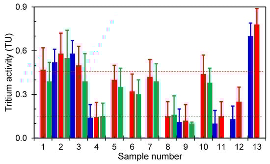 Different national and international entities have developed worldwide guidelines for tritium levels. As an example, the United States Environmental Protection Agency (USEPA) has established a threshold of 11.1 Bq/L as the limit for tritium concentration in groundwater []. The United Nations Scientific Committee on the Effects of Atomic Radiation (UNSCEAR) has defined a safe limit of 40 Bq/L in their published report [], while the European Commission (EC) and World Health Organization (WHO) consider 100 Bq/L as the action limit [,]. It is worth noting that all the samples analyzed in this study had tritium levels far below these limits.