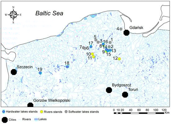 The study focused on conducting field research in northern Poland, specifically examining two types of lakes and rivers as the primary locations of interest. Plant material, comprising an average of 10 specimens of the species E. canadensis from rivers, streams, and hardwater lakes, was collected between 2008 and 2010 at seven research sites located in slow-flowing places along three lowland sandy rivers. An additional seven sites in hardwater lakes provided material for the study. Material from seven softwater lakes was sampled in 2020 (Figure 1, Supplementary Materials Table S1). The classification of softwater lakes followed the recommendation of Murphy [33]. Shortly, the non-degraded softwater lakes are characterized by low Ca2+ concentration (from almost 0 to 15 mg/L) and low conductivity (from about 10 µS cm−1 to no more than 200 µS cm−1). Hardwater lakes are characterized by greater Ca2+ concentrations and higher conductivity.