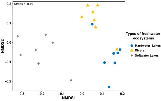 The nMDS analysis based on the collected physicochemical data clearly substantiated the assumed differentiation between the analyzed freshwater ecosystems (Figure 2). It is worth mentioning that the two sites, one from hardwater lakes and one from rivers, were grouped differently. Nonetheless, despite the similarities observed in the groups of freshwater ecosystems studied, the ANOSIM similarity analysis showed statistically significant differences between the ecosystems (ANOSIM statistic: r = 0.59, p < 0.001). To highlight the significant differences in the investigated freshwater ecosystems based on variables used in nMDS analysis, the Kruskal–Wallis multiple group independent rank test results are listed in Table 1. The obtained results show that most of the investigated variables (especially DIC, HCO3−, CO3−2, and Ca2+) differentiate the three investigated types of freshwater ecosystems (Table 1). The results of the Dunn post hoc test with Bonferroni correction following the Kruskal–Wallis test determining the differences between investigated ecosystems are presented in Table S2 in Supplementary Materials. It should be highlighted that those parameters listed in Table 1 where p = 0.001 exhibit a statistically significant difference (the Dunn post hoc test with Bonferroni correction) between softwater lakes compared to hardwater lakes and rivers, or between only softwater lakes and rivers (for details, see Table S2 in Supplementary Materials).