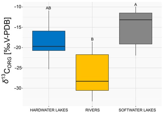 Comparison of δ13CORG (‰ V-PDB) of E. canadensis in three types of investigated water ecosystems (n = 7 for each group). The box represents 25–75%, the line inside the box represents the median, and the whiskers represent the minimum and maximum values excluding outliers. Different letters above boxplots indicate statistical significance (p < 0.025) as determined by the Dunn post hoc test with Bonferroni correction following the Kruskal–Wallis test.