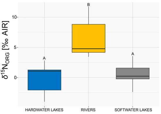 An evaluation of the δ15NORG results in the studied ecosystems revealed significant differences within them (K–W H = 12.94, p < 0.001, as shown in Figure 4). The δ15NORG values of E. canadensis were the highest in rivers, and they significantly differed from values in soft- and hardwater lakes (Figure 4, p < 0.025 with Bonferroni correction). In contrast, the δ15NORG values observed for hardwater lakes did not exhibit statistically significant differences compared to those recorded for softwater lakes (Figure 4, p > 0.025 with Bonferroni correction).