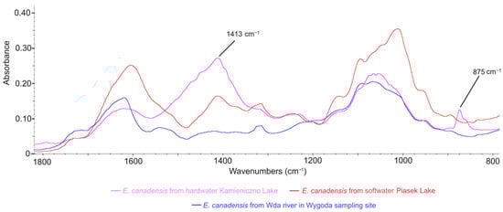 Thus, in this study, we decided to apply the fast FTIR-ATR method, which might help in distinguishing the material collected from hardwater and softwater lakes. Comparisons of the E. canadensis FTIR spectrum results allow for effectively differentiating material from hard- and softwater lakes, but only when nondecarbonated material from hardwater lakes is used for analysis. In the decarbonated material, the peaks associated with calcium carbonate, located at 1413 cm−1 and 875 cm−1 in the FTIR-ATR spectrum, do not manifest (see comparison in Figure 7). These additional analyses provide crucial information that might help with revealing the environmental origin of the investigated E. canadensis. It is significant to point out that this type of analysis might be helpful to environmental identification in the case of macroscopic green algae, especially species from the Nitella genus (Pronin—unpublished data), which might be found in softwater and hardwater lakes [14].