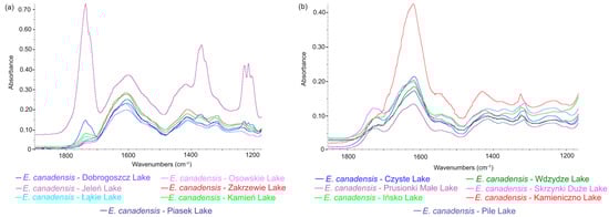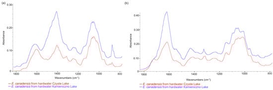 The FTIR spectra comparison of decarbonated samples: (a) E. canadensis samples collected from softwater lakes and (b) E. canadensis samples collected from hardwater lakes, n = 7 for each group.
