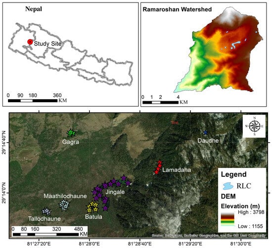 The Ramaroshan Lake Complex (RLC) is situated at an elevation of 2050 m to 3792 m above mean sea level in the Ramaroshan Rural Municipality, Ward 5 of Achham District (Figure 1), Sudur Paschim Province, Nepal. The Ramaroshan area is known for its 12 lakes and 18 patans (lust grasslands) [31]. The lakes are interconnected with each other forming a complex with the Kailash Khola (the small river) as its major outlet [32]. The climatic conditions of the Ramaroshan area range from subtropical to cool temperate, with an annual average mean temperature of 30 °C (maximum) to 5 °C (minimum) and an average annual rainfall of 1891 mm/ year [30]. Jingale Lake, a C-shaped lake, is the largest and deepest lake of the RLC. Geologically, the RLC lies predominantly on Sallyanigad and Kalikot formations which consist of major rock types of granite, gneisses, limestone, and schist [33]. The soil of Tallodhaune and Mathilodhaune Lakes is gray-colored and has a loamy sand texture, while the soil of Jingale, Batula, and Lamadaha Lakes is dark-colored and has a clay loam texture [30]. The morphometric features of the lakes in this study are presented in Table 1.