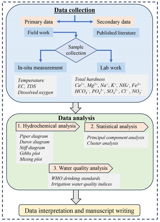 To achieve the research objectives, we collected both primary and secondary data. Primary data were obtained through fieldwork along with laboratory analysis. These data were subjected to various analytical methods including hydrochemical analysis, multivariate statistical analysis, and water quality analysis, followed by comprehensive interpretation (Figure 2). The secondary data were retrieved from a review of prior studies and used for the comparative analysis of the hydrochemistry of the RLC with other study sites.