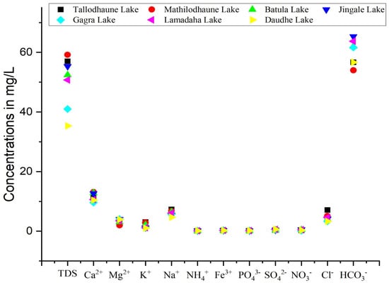Electrical conductivity (EC) is an indirect measure of TDS which is influenced by ionic species concentration, volume, and its rate of movement [45]. The mean value of EC and TDS in the present study (100.03 ± 15.42 µS/cm and 52.39 ± 7.16 mg/L, respectively) suggests a low-mineralized freshwater that receives less inorganic and organic inputs. The mean concentration of TDS in the seven lakes (from least to greatest) was Daudhe, Gagra, Lamadaha, Batula, Jingale, Tallodhaune, and Mathilodhaune (Table 3). The lower TDS and EC values in the study sites may be attributed to rainfall dilution [42], slow rates of weathering [46], and the consumption of electrolytes and ions by aquatic plants [24].