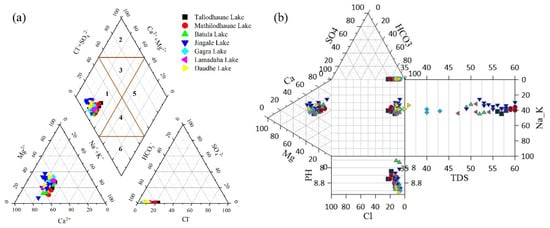 The elevated concentrations of dissolved ions influence water quality. The major dissolved cations (Ca2+, Mg2+, Na+, K+) and anions (HCO3−, CO3−, SO42−, Cl−, NO3−) in water help to determine its suitability for drinking, irrigation, and other purposes and also to understand the natural mechanisms and anthropogenic activities impacting the lake [11]. Rock weathering, precipitation, and evapo-crystallizations are the three main natural mechanisms that are the source of ions and control the hydrochemistry of surface water [12]. Ca2+, Mg2+, and HCO3– found in water result primarily via the interaction of geospheric minerals with atmospheric CO2 [13]. K+ and Na+ are generally derived from the weathering of silicates and evaporites, while the sources of Cl– and SO42– are primarily the evaporite dissolution [14].
