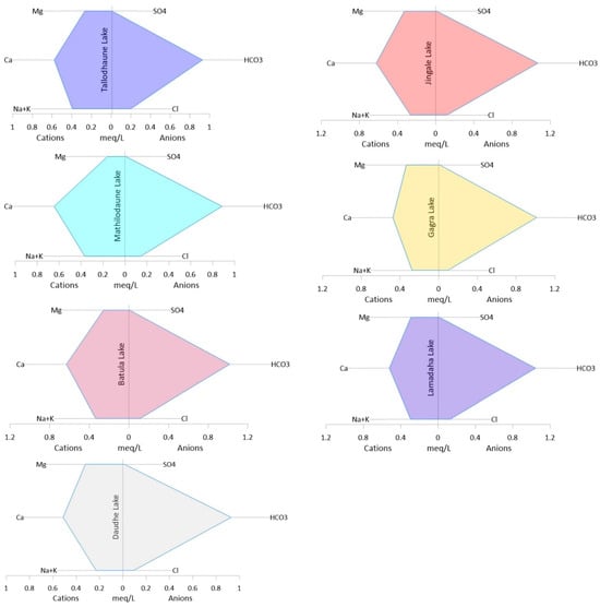 A Stiff diagram was used to show the major ion composition in the water. According to the Stiff diagram (Figure 5), the order of cations (from greatest to least) for four of the lakes (Tallodhaune, Mathilodhaune, Lamadaha, and Gagra) was Ca2+, Na+ + K+, and Mg2+, while the three other lakes (Batula, Jingale, and Daudhe) had the order Ca2+, Mg2+, and Na+ + K+. The order of major anions for each lake was HCO3−, Cl−, and SO42−. The hydrochemical facies in the study region was the Ca-HCO3 type, as indicated by the fact that the dominating cation and anion were Ca2+ and HCO3−, respectively.