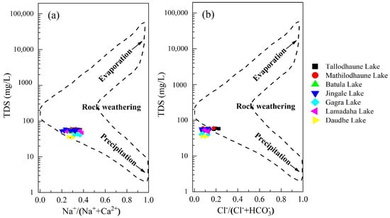 Gibbs [12] suggested a relationship between TDS and Na+/(Na+ + Ca2+) or TDS and Cl−/(Cl− + HCO3−), which reveals the relative importance of the three main natural processes that control the chemistry of surface water, namely, atmospheric precipitation, evaporation, and rock weathering. In the Gibbs plot (Figure 6), most of the water samples are located in the middle part (rock dominance zone), indicating that rock weathering is the primary factor dictating the ion chemistry of the RLC. Thus, based on the Gibbs plots, the TDS values in the lakes under study registered at less than 100 mg/L. Additionally, the molar ratios of Cl−/(Cl− + HCO3−) and Na+/(Na+ + Ca2+) for all samples were below 0.5. These findings were consistent across all water samples which were predominantly situated in rock-dominated areas.