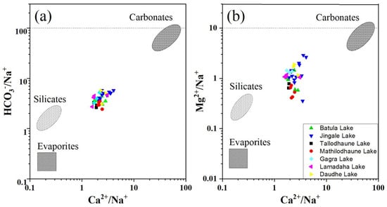 A mixing diagram, plotted using average ionic ratios, can be used to trace the sources of dissolved ions in a freshwater system and explain the hydrochemistry that controls them [15]. Different combinations of dissolved cations and anions in water are produced by the weathering of different parent rocks (carbonates, silicates, and evaporites). For example, the weathering of carbonates, silicates, and evaporites yields Ca2+ and Mg2+; the weathering of evaporites and silicates produces Na+ and K+; and HCO3− originates from carbonates and silicates, whereas the source of SO42− and Cl− is from evaporites [17]. In the mixing diagram (Figure 7), the water samples fall between the carbonate and silicate dominance zone and are far from the evaporation dominance zone, which indicates that carbonate followed by silicate weathering are the main factors that govern the hydrogeochemical process. Generally, carbonates are more soluble than silicates (12–40 times), hence they are more likely to weather in natural conditions [13].
