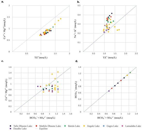 The Ca2+ + Mg2+ vs. Tz+ scatter plot (Figure 8a) for the lake water had a linear spread below the equiline 1:1, indicating that Ca2+ + Mg2+ was the primary contributor to the total cations. Additionally, in the scatter plot of Na+ + K+ vs. Tz+ (Figure 8b), most of the water samples were above the equiline 1:1, signifying a lesser contribution of Na+ and K+ to the total cations [19].