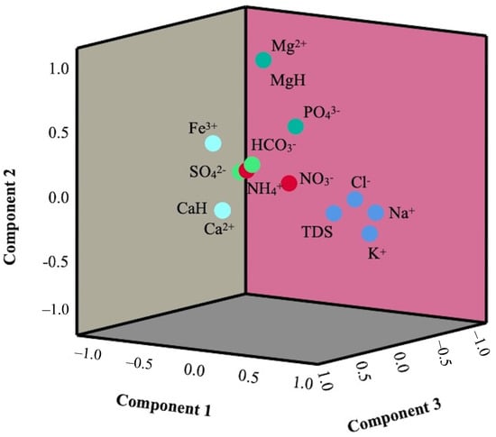 A principal component analysis (PCA) is a statistical technique that reduces the dimensionality of datasets by transforming a large set of variables into a smaller one without losing the originality of real data [65]. To accomplish this, PCA uses a covariance matrix of actual data to derive eigenvectors and eigenvalues. The eigenvalues of principal components (PCs) 1, 2, 3, 4, and 5 were found to be 3.83, 2.75, 1.68, 1.53, and 1.04, respectively (Table 5). The five PCs explained about 77.55% of the total variance (Figure 9). PC1 accounted for 27.36% of the variance and was highly loaded on TDS, Cl−, Na+, and K+. The association of these hydrochemical attributes indicates their sources from natural processes such as weathering along with evaporite dissolution [13]. PC2 was loaded with Mg2+, Mg hardness, and PO43−, which explained about 19.69% of the variance (Figure 9). The association of Mg2+ and PO43− signifies the formation of magnesium phosphate in water. Likewise, PC3 accounted for 12.04% of the variance and was loaded with Ca2+, Ca hardness, and Fe3+, the source of which might be attributed to a geogenic origin. NO3− and NH4+ showed a positive loading in PC4, which explained about 10.95% of the variance in the result. These findings indicate the common sources of these two parameters, which might result from anthropogenic activities. PC5 was positively loaded on HCO3− and negatively loaded with SO42−, which suggests that the source of these two parameters is different. The source of HCO3− might be from weathering reactions and the decomposition of organic matter [27], while the source of SO42− might be from the dissolution of sulfate minerals, the oxidation of sulfide minerals, or from anthropogenic activities [66].