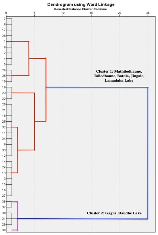 Gagra and Daudhe Lakes, which are located at higher elevations away from human settlements and are characterized by very low TDS, were grouped in the same cluster, whereas the other five lakes (Mathiolodhaune, Tallodhaune, Jingale, Batula, and Lamadaha), which were interconnected and close to human settlements with relatively high TDS, were grouped in the same cluster, which signifies the influence of similar geological processes and anthropogenic factors.