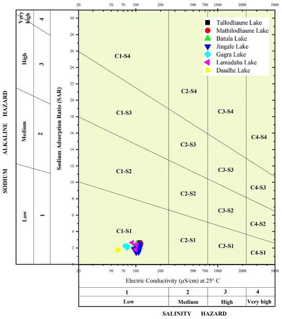 Surface water is the primary source of water used in agriculture, and the quality of that water plays a crucial role in plant growth and productivity. The chemical composition of water determines its suitability for irrigation. Numerous irrigation water quality indices can be used to evaluate the quality of irrigation water, such as sodium adsorption ratio (SAR), sodium percentage (%Na), Kelly’s ratio (KR), permeability index (PI), magnesium hazard (MH), and cation ratio of soil structural stability (CROSS) [15]. In agro-based developing countries like Nepal, where the economy is heavily reliant on the agriculture sector, irrigation quality assessment of lakes can play a crucial role in meeting increasing water demands and promoting sustainable agriculture practices.