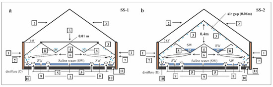 Figure 1. Schematic of the basin-type solar still versions: (a) the upper basin is in the form of an air heater, (SS-1); (b) the upper basin is in a conventional distiller (SS-2). 1: body housing; 2: 2-slope cover; 3: glass cover; 4: upper basin-2; 5: lower basin-1; 6: condensate collector; 7: condensate drain channel; 8: hole for the supply and discharge of cold seawater; 9: opening for water supply to the channels of the pool-1; 10: nozzles; 11: fixing the bottom to the front panel.