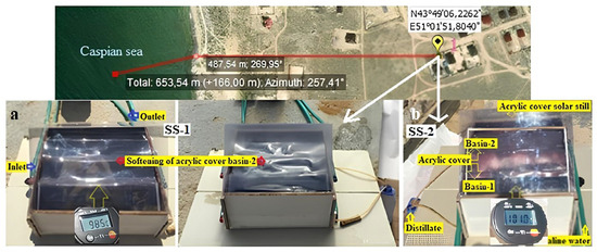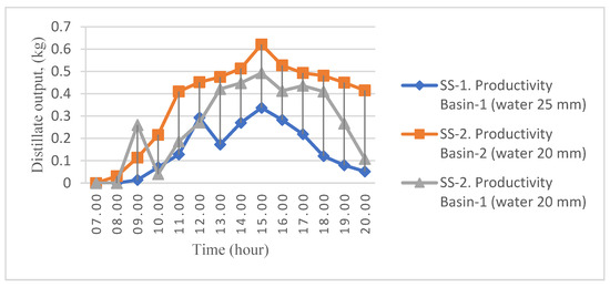 Less condensate output from the surface of basin-1 in SS-1 is linked to the thickness of the water layer in the basin. In order to increase productivity in SS-1, the water layer in basin-1 was equal to 25 mm, which did not bring to a greater condensate output. In the SS-2 version, the water layer thickness in the basin-2 and basin-1 was 20 mm, which achieved higher productivity compared to SS-1 (Figure 5). The employment of basin-2 in SS-1 for heating the air did not contribute to the distillate output and productivity.