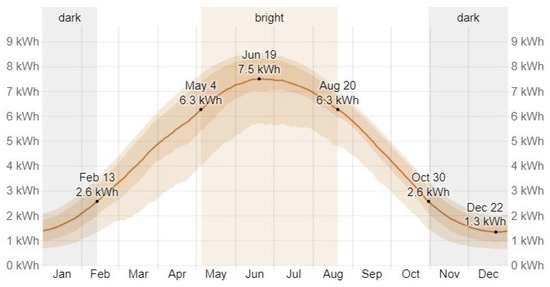 This daily influx of shortwave solar energy reaching the ground across a broad area comprehensively considers seasonal fluctuations in daylight duration, the Sun’s elevation, and absorption by clouds and other atmospheric components. Shortwave radiation encompasses visible light and ultraviolet rays. The average daily intake of shortwave solar energy undergoes significant seasonal shifts throughout the year. The sunnier stretch extends for 3.5 months, spanning from 4 May to 20 August, with an average daily receipt of over 6.3 kWh per square meter. June stands out as the brightest month in Aktau, boasting an average of 7.4 kWh. Conversely, the darker phase covers 3.5 months, from 30 October to 13 February, registering an average daily intake of short wave energy below 2.6 kWh per square meter. December marks the darkest month in Aktau, recording an average of 1.4 kWh. Annual average solar energy is shown in Figure 4.