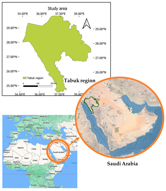 A case study was developed to evaluate the geographical impact of wastewater treatment plant site selection optimisation in the Tabuk region, northwest of the Kingdom of Saudi Arabia. The region extends between longitudes of 34.6° E and 39.9° E and latitudes of 24.6° N and 29.97° N. The arid region has an area of 146,072 km2 and a population of over 900,000 inhabitants, with a long coastline along the Red Sea and an annual rainfall of 40 mm. Urban development in Tabuk is directly connected to the agricultural industry and the NEOM project. Therefore, careful infrastructure planning is needed to adapt to the expected increase in the population. Currently, there are seven wastewater treatment plants in the western part of the region, with an annual average capacity of 131,665 m3/day. Figure 1 shows the case study location, with the extent of the Tabuk region highlighted in green.
