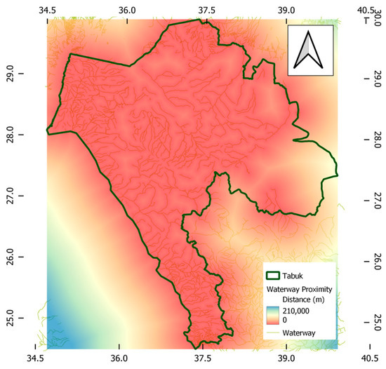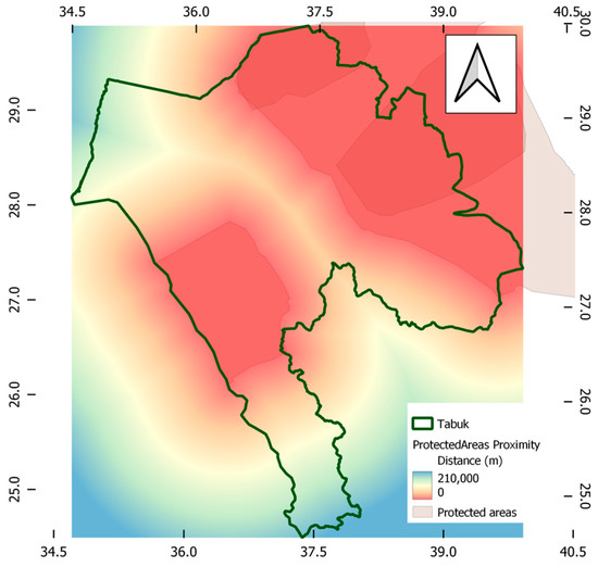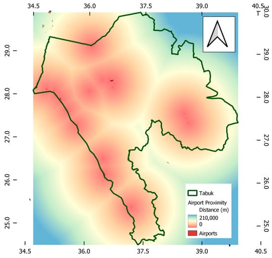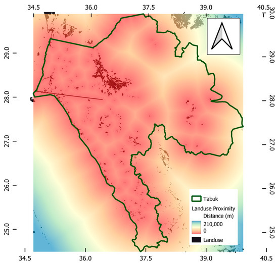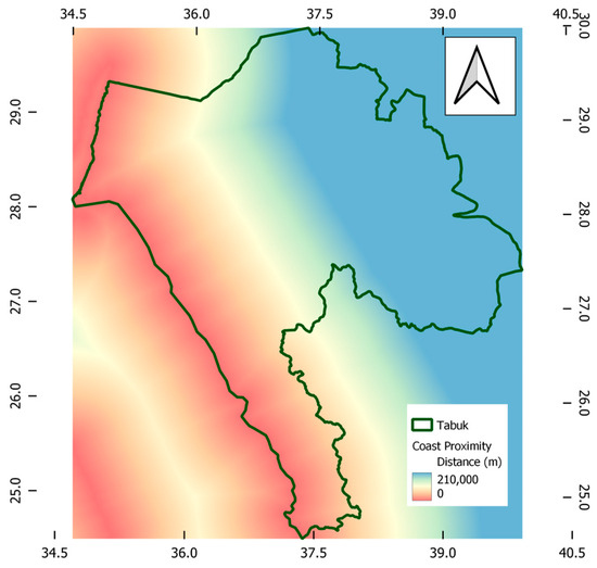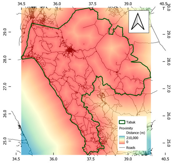Data sets imported from the open street database [25], Google Earth [26], and NASA Earth data [27] were analysed via QGIS software. The different datasets were processed to be properly presented and analysed in the GIS environment under the current case study requirements. The cross-reference of mutual information from these datasets verified the geographical bases of the created FAHP-GIS model. The calculated distances from various sources resulted in the maps of proximity range shown in Figure 3, Figure 4, Figure 5, Figure 6, Figure 7 and Figure 8. These maps presents the information needed to perform further analysis of distance measurements and suitability memberships. It should be noted that the map scale colours were unified for all created proximity files to be measured in metres, with the red colour indicating a shorter distance to the measured criteria than the blue spectrum.