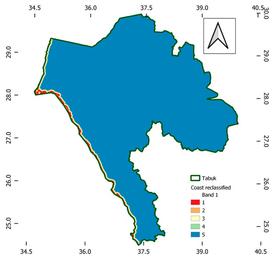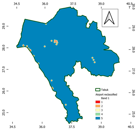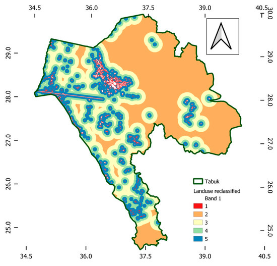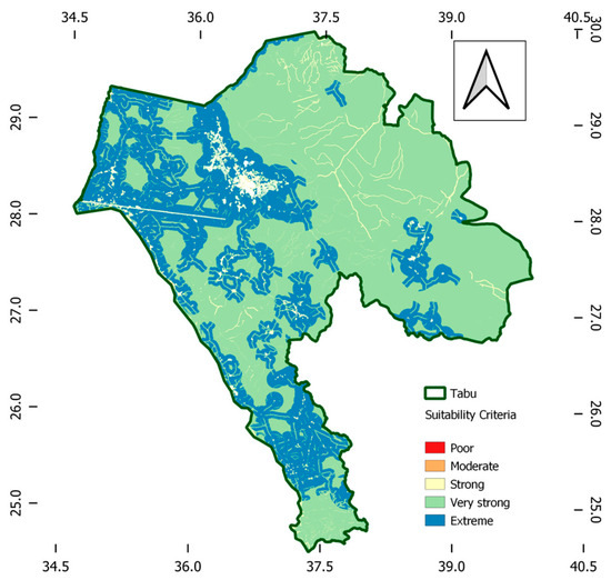 A suitability map for the placement of the wastewater treatment plant in the Tabuk region was eventually developed by merging the criteria weights from FAHP with the parametric proximity maps using the raster calculator tool in the QGIS software. The spatial analysis module of QGIS (Raster Calculator) was used to multiply the membership values of each layer by its aggregated FAHP weights, then adding these results to overlay the Criteria Maps to integrate GIS and FAHP weights. Layers of land use, distance from wetlands and waterways, distance from roadways and airports, and distance to the coast are inputs of the performed MCDM analysis. The result of the raster calculation was then reclassified into five categories to reflect the suitability criteria from poor to extreme preference for land. Figure 16 shows a suitability map for the selected case study. The existing wastewater treatment plants are observed to be located within extremely preferred parts of the region. However, more facilities are needed for infrastructural development in the far southern and eastern parts of the regional community.