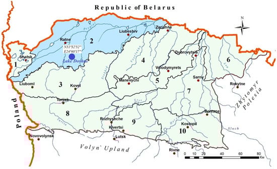 The localization of Lake Doshne within the broader context of the physical and geographical zoning of Volyn Polissia, Ukraine. Symbols: Physiographic regions 1—Shatsk, 2—Upper-Prypiat, 3—Liuboml-Kovel, 4—Lower-Styr, 5—Manevychi-Volodymyrets, 6—Lva-Horyn, 7—Kolky-Sarny, 8—Turiisk-Rozhyshche, 9—Kivertsi-Tsuman, and 10—Kostopil-Berezne.