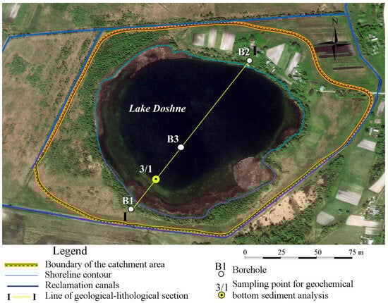 Three boreholes were drilled within the lake: two in the terraced part of the catchment area and one in the lake’s water area. The research also included probing the bottom sediments to develop a stratigraphic section of the sediments of Lake Doshne (Figure 2).