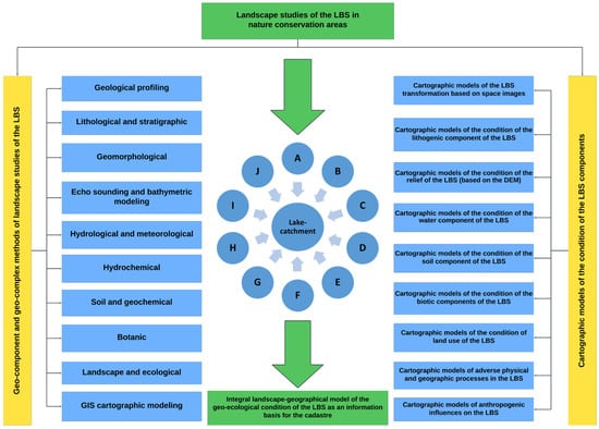 The structure, methods, and results of landscape and geographic studies of lake basin systems (LBSs) in nature conservation areas. Legend of the geo-ecological parameters of the “lake-catchment area” system: A—geological; B—geomorphological; C—meteorological; D—hydrological; E—hydrochemical; F—lithological and stratigraphic; G—soil; H—geochemical; I—biotic; and J—anthropogenic.