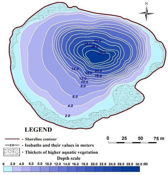 The area of Lake Doshne, as determined by our assessment, is 0.19 km2. The lake is relatively deep, with a maximum depth of 28.5 m and an average depth of 6.5 m. The slopes of the lake basin are steep, becoming less pronounced in the nearshore zone. The peripheral zone of the lake is characterized by tall aquatic vegetation, clearly visible in satellite images. Based on the results of a sounding survey conducted using the Lucky FFW718 sounder, we developed a bathymetric model of the lake with a depth interval of 2.0 m (Figure 4).