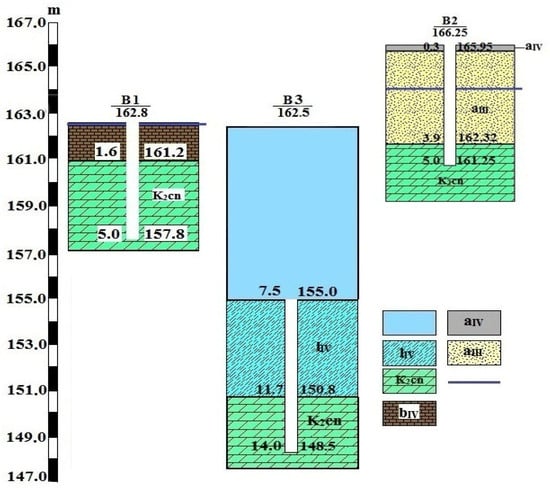 Litho-stratigraphic columns (B1, B2, B3) of anthropogenic and pre-Quaternary sediments of Lake Doshne and the lake terrace. Legend: —the numerator is the number of the borehole, the denominator is the absolute mark of the relief (according to the Baltic Height System); lIV—modern lake sediments—sapropel; K2cn—the Coniacian—chalk, marl; bIV—modern swamp sediments—peat; aIV—modern alluvial sediments—sands; aIII—Upper Quaternary alluvial sediments—sands and sandy loams;